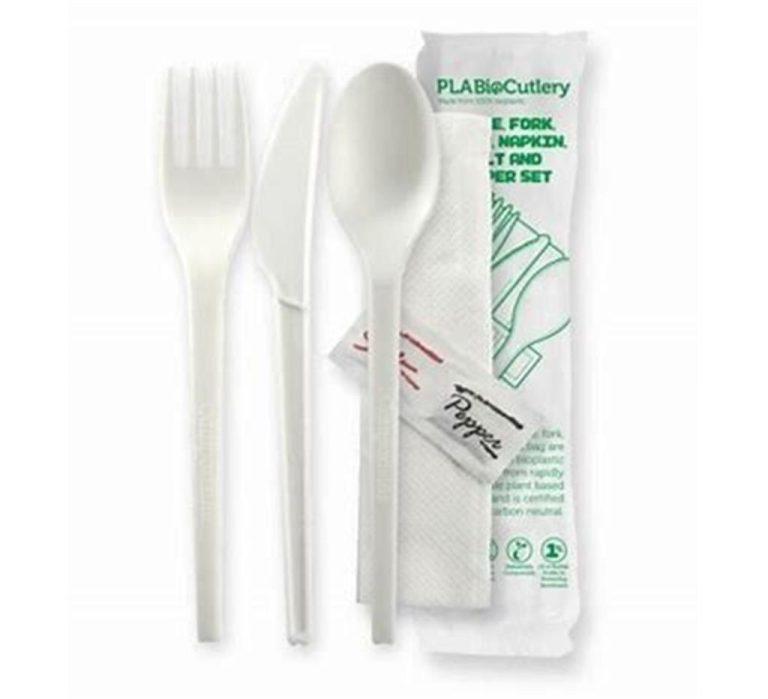 16.5CM (6.5″) PLA KNIFE, FORK, SPOON, NAPKIN, SALT & PEPPER SET – WHITE