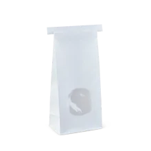 Retail window bags are poly-lined for freshness, and feature a window to showcase the contents. They’re ideal for dry foods like coffee beans, loose leaf tea, biscuits, and nuts, and can be sealed with a bar heater. Polylining is 100% BPA-free. The medium tin-tie bag can also be resealed with the tin-tie, and is offered in white.